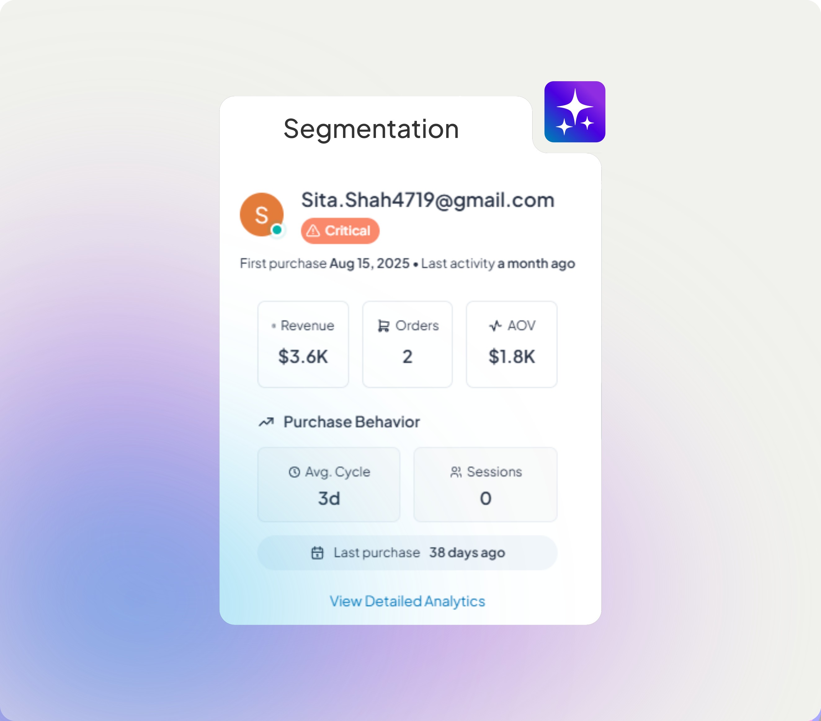 Automatically creates customer groups based on your configuration, tracking revenue, acquisition, retention, engagement, and more. Understand behavioral patterns, churn risk, CLV, and customer lifecycle segments instantly. Works standalone or integrates seamlessly with other tools in the ecosystem for deeper insights.