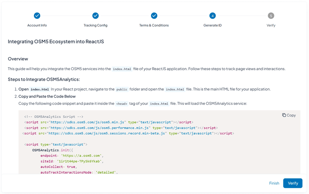 Our streamlined onboarding process guides you through every decision, from privacy configuration to code generation. Each step is designed to match your organization's values and business goals while ensuring maximum data quality and user respect.
